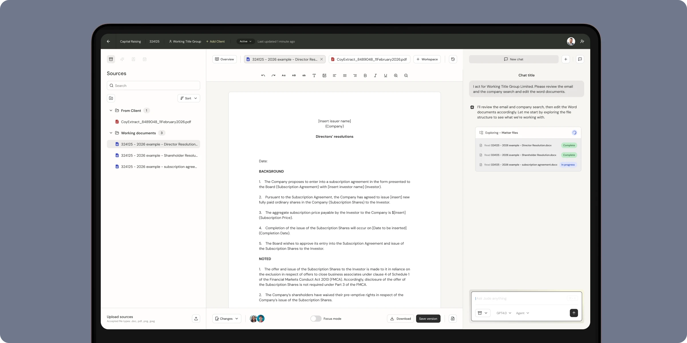 Create complex legal documents in minutes, not hours. Jude writes directly to your templates, adapting to your matter context while meeting your firm's standards.