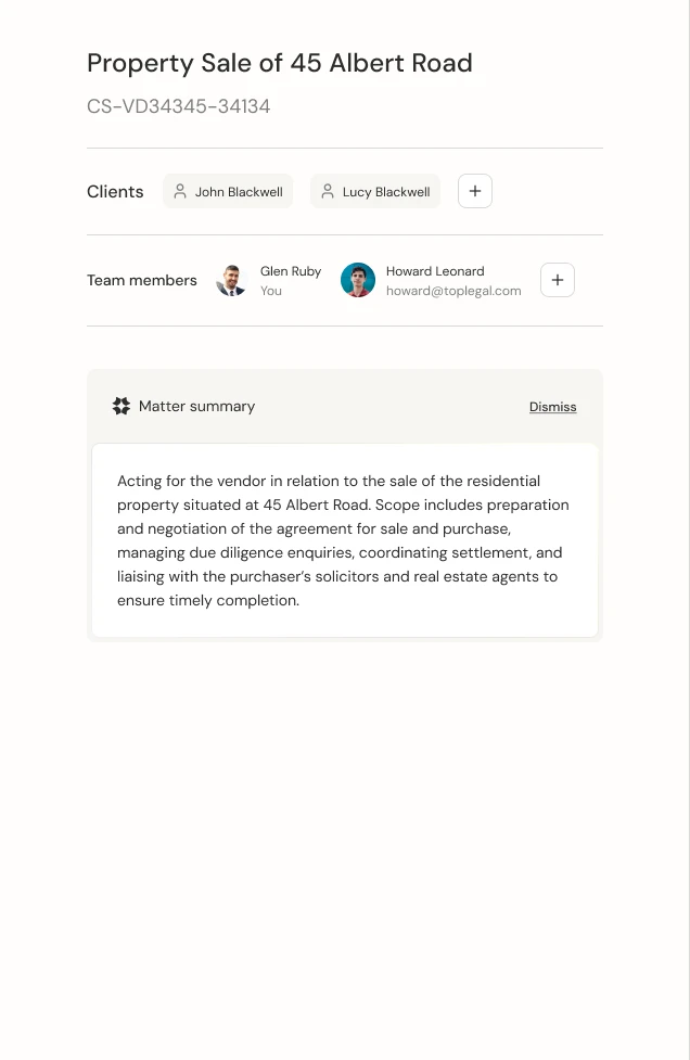 See your matters in one place. All documents, drafts, deadlines, and team activity are centralised so you never have to search across multiple systems.